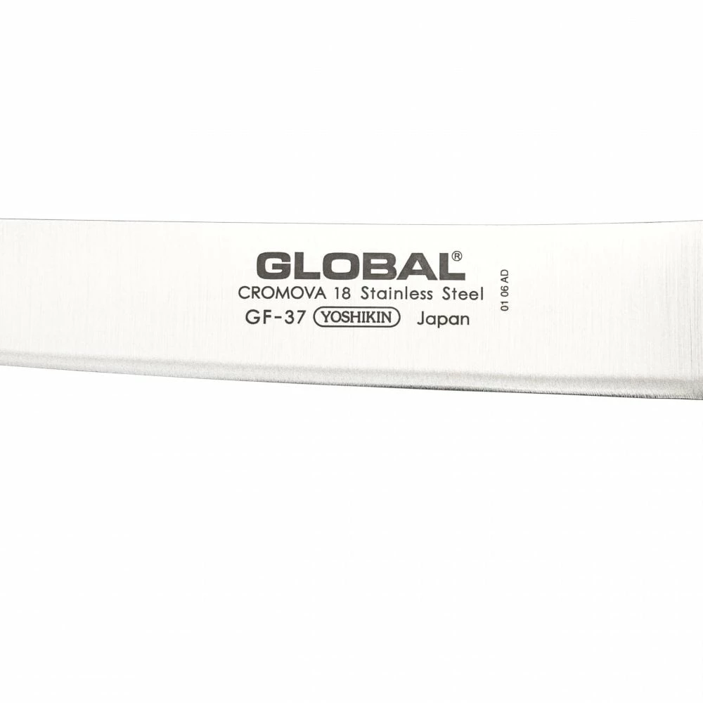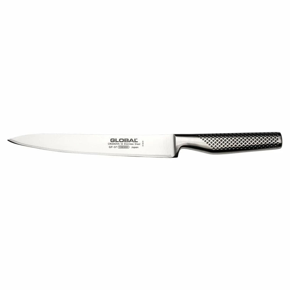 • The GF-37 is Global’s fully forged carving knife. It features a long 22cm blade, which can easily slice through the best cuts of meat. the addition of a bolster gives a bit of extra protection. With a long narrow blade the knife can also be used for filleting fish, slicing fish or preparing sashimi. It makes a poor chopping knife, because the blade is in line with the bottom of the bolster, meaning the knife can only really be used for slicing by drawing the knife backwards.