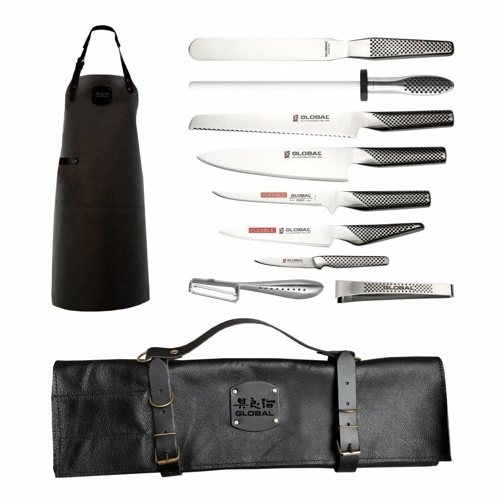 The set comes with a deluxe leather Global branded leather knife roll and bib apron.