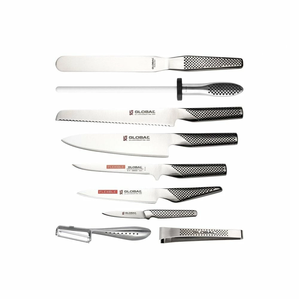 Global Classic Range 35th Anniversary Special Edition Cromova18 Stainless Steel Hollow Handles Rockwell C56-58 Acute 15 Degree Cutting Edge Handwash Only Designed by Komin Yamada Made in Japan