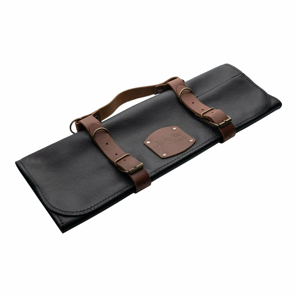 The set comes with a deluxe leather Global branded leather knife roll and bib apron.