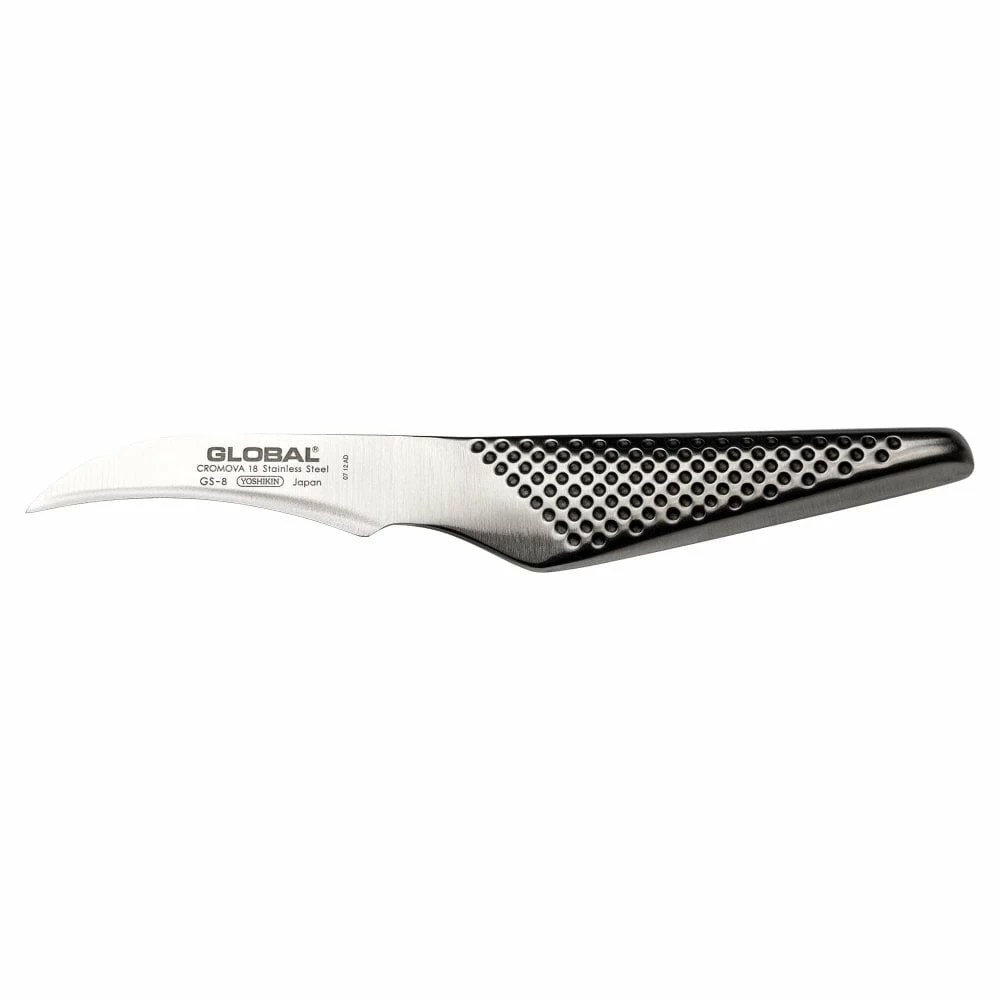 The GS-8 is a specialist peeling knife and has a curved blade to work around carrots, potatoes and other vegetables and fruits. The knife has the same blade as the GSF-17 but the GS-8 has the standard hollow handle of the Global GS range. We recommend this peeler for chefs with bigger hands who find the GSF range too small.