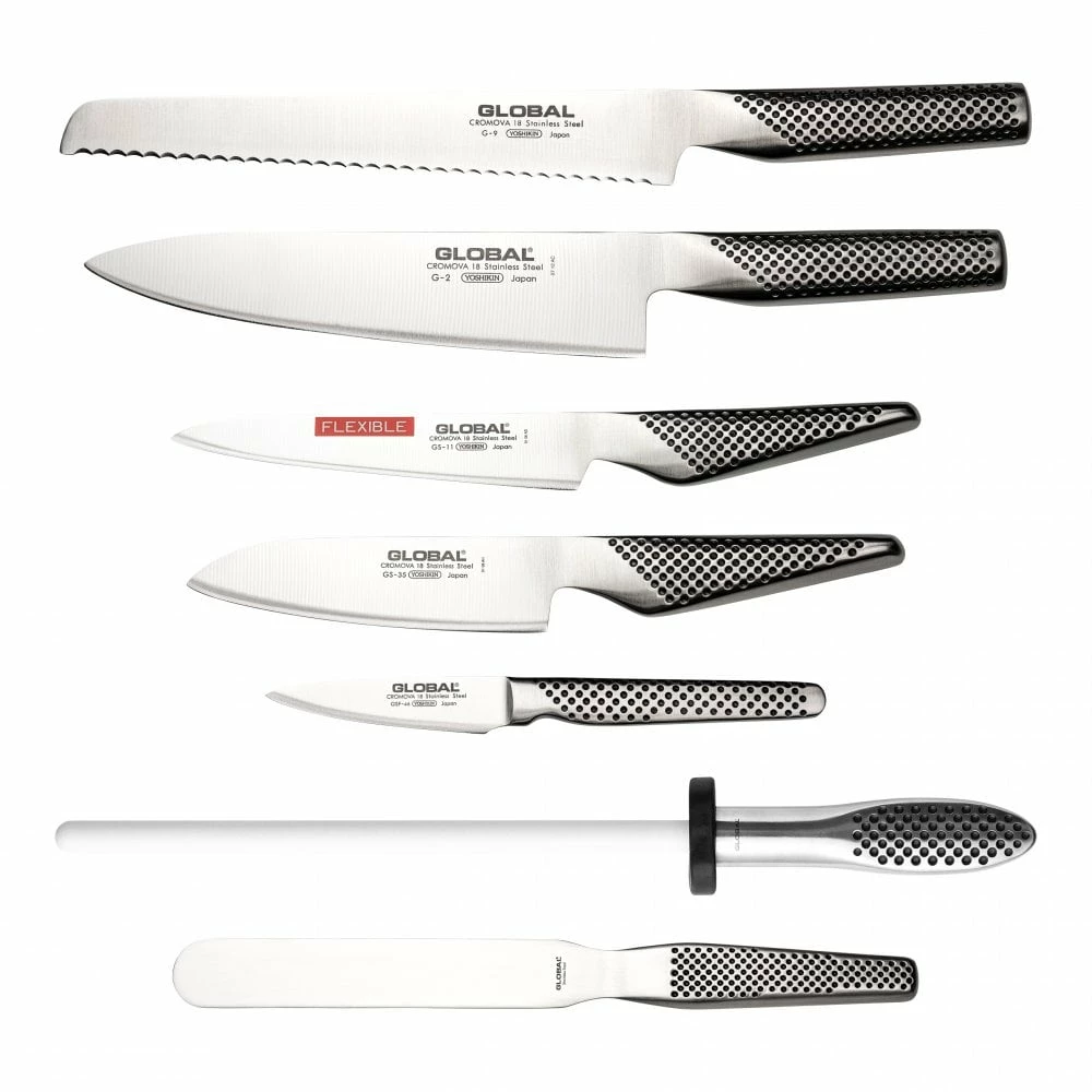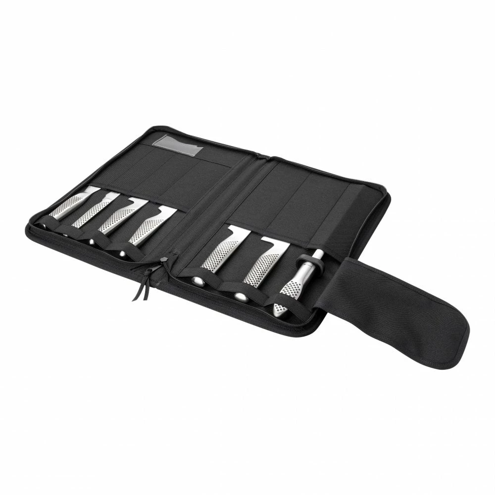 • For the aspiring chef. A fantastic set of knives, that will cover all tasks in professional kitchens. The set also contains a Global ceramic rod sharpener to keep your knives in top condition. The zip lock nylon case will allow you to store and take your knives anywhere safely and conveniently.