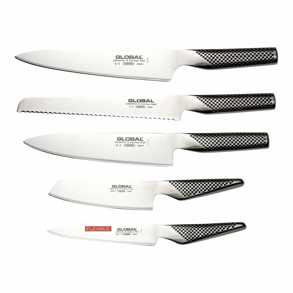 This kitchen knife set includes 5 exquisite kitchen knives including a G-2 Cook’s Knife 20cm, G-3 Carving Knife 21cm, G-9 Bread Knife 22cm, GS-5 Vegetable Chopping Knife 14cm and a GS-11 Flexible Utility Knife 15cm, plus knife dock. All your kitchen essentials will carry out a wide range of slicing, dicing and chopping tasks.