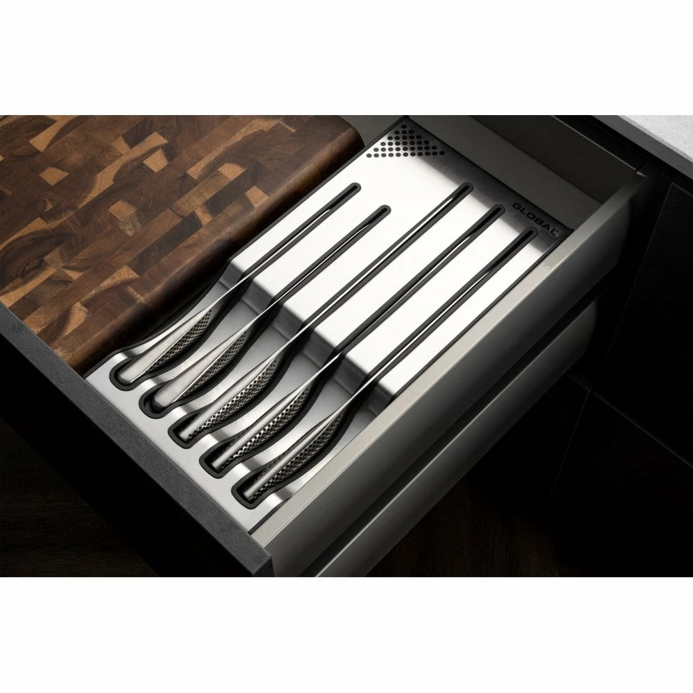 These smart G-88/239511 Global knife docks can be displayed on a counter but also fit perfectly in a drawer if you are lacking on space. It is the ideal storage solution if you have extra Global knives that don’t fit in a block and are loose in a drawer.