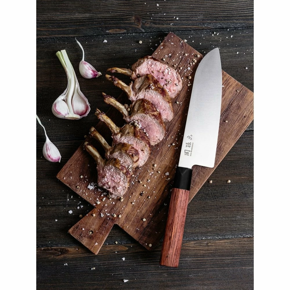 Seki Magoroku Redwood is a series of chef’s knives with a robust stainless steel quality and typically Japanese features. With its highly polished blades, the series includes both single-edged and double-edged blades that share the common denominators of stable and well-balanced functionality as well as sharpness. The design combines a minimalist shape with traditional Japanese aesthetics. The name stems from the redwood timber used to make the inserted handle. This hardwood has a naturally high oil content and is particularly moisture resistant.