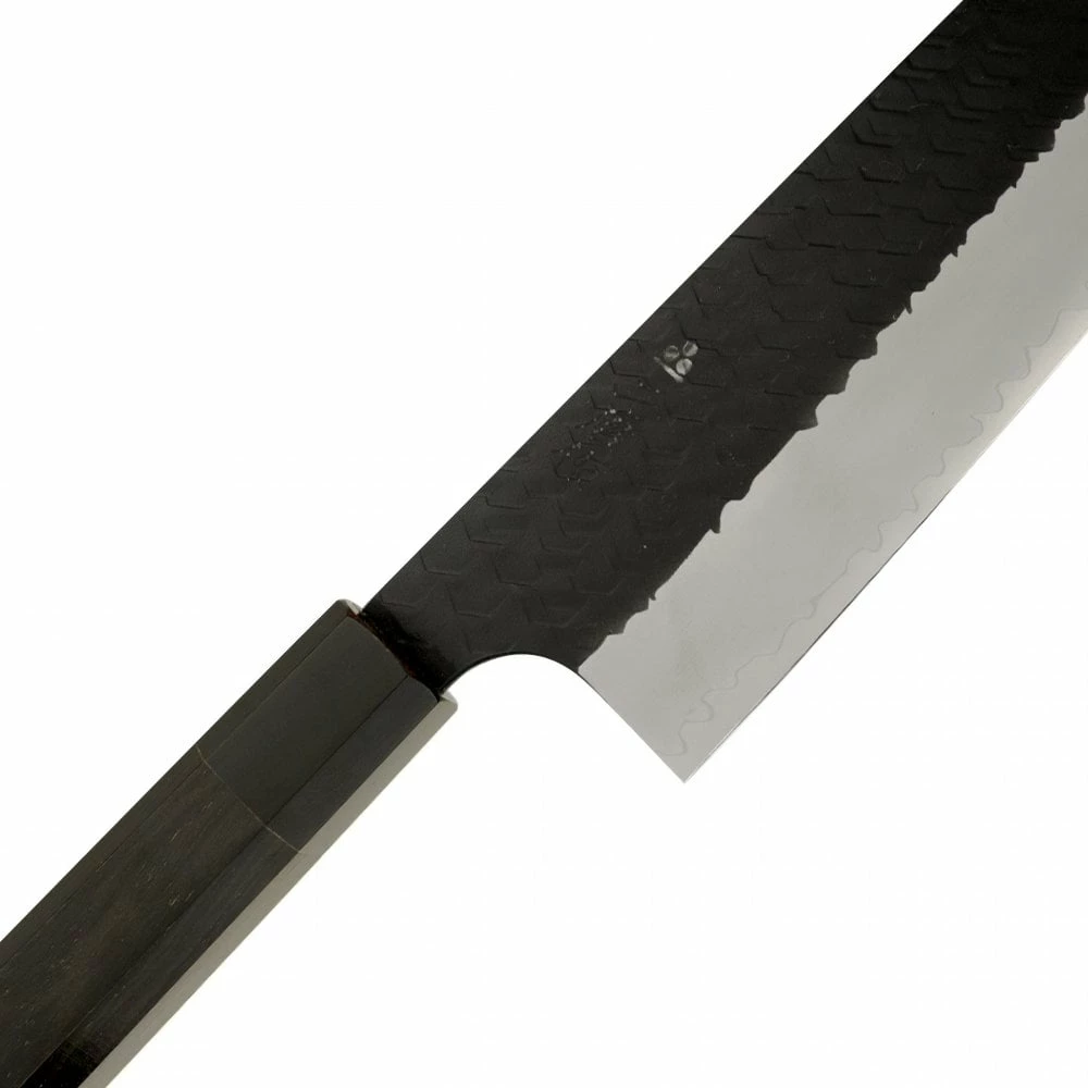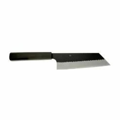 The handle of the Nigara Hamono knife is crafted from beautiful octagonal black ebony, offering a comfortable grip and a visually pleasing aesthetic. The handle is further enhanced by a black buffalo horn bolster, adding a touch of elegance to the overall design. This combination of materials not only provides a secure grip but also adds to the knife’s overall balance and manoeuvrability.