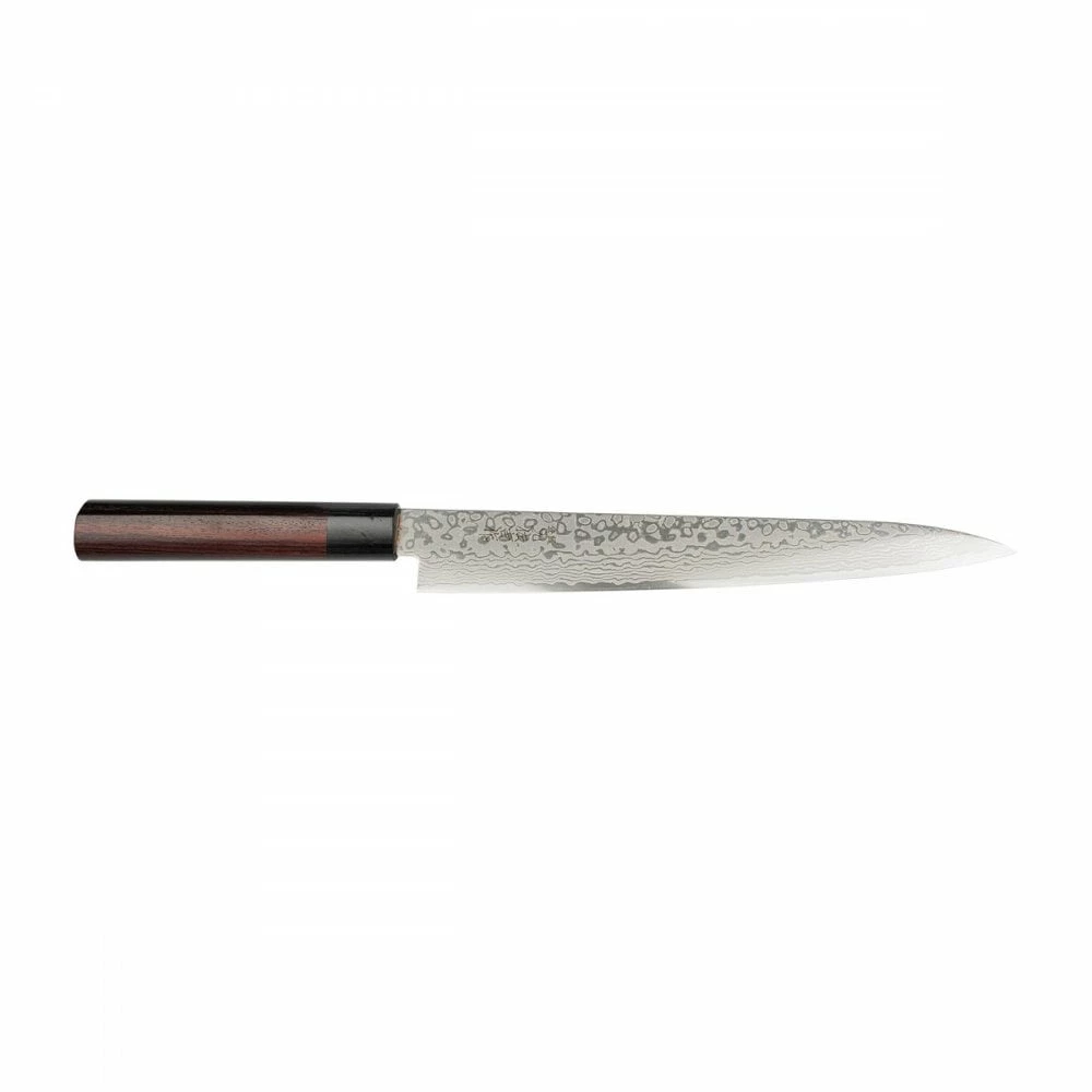 To start with the ZA-18 steel is user friendly and has rust-resistant properties that make it easy to care for. The Alloy composition of ZA-18 is made up of cobalt, molybdenum, chromium with a carbon content that is slightly higher than the level found in VG-10, giving the blade a higher resistance to corrosion and a touch more strength and durability. VG-10 being the steel of choice for most of the blacksmiths that make up the Takefu Knife Village. The steel is tempered to give a hardness of around 61-62HRC. ZA-18 Damascus Gyutou is a superb, versatile kitchen knife with a great balance, incredible sharpness, resistance to rust, easy to maintain and to sharpen, with a beautiful 69-layered Damascus patterning. The handles are a beautiful Rosewood D-Shape. The ZA-18 Damascus Gyutou is made by the leading blacksmith of Yoshida Hamono, Osamu-San. The blades are decorated with 69 layers of Damascus patterning. The Gyuto knife or chef’s knife is a great all-around knife that will perform most kitchen tasks.