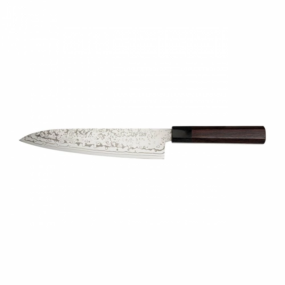 The ZDP-189 core is clad by a layer of Damascus steel which protects the ultra hard inner core. Very few factories have the proficiency to work with ZDP-189 and these knives are hard to come by. The damascus line is the premium collection from Yoshida Hamono, production time is typically a year and we are only able to come by a few pieces each year.
