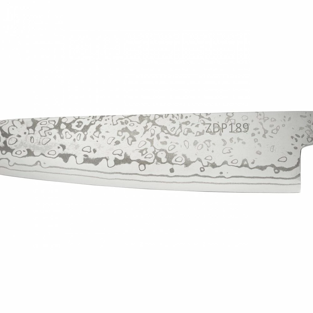 Yoshida works with one of the hardest stainless steel commerically available. ZDP-189, manufactured by Hitachi Metals is one of the highest quality stainless steels available on the market. A powdered steel, ZDP-189 can be hardened up to 66/67 HRC, harder than all other stainless steels. Few factories have learnt how to take advantage of these ultra hard steels, but nevertheless these knives will retain their cutting edge for an extremely long time before needing to be resharpened.